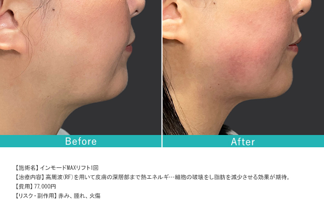 インモードMAXリフトは通常のインモードリフトの2倍以上の総熱量を与えるため、皮下脂肪が多い場合や中程度のたるみがある場合に適しています。